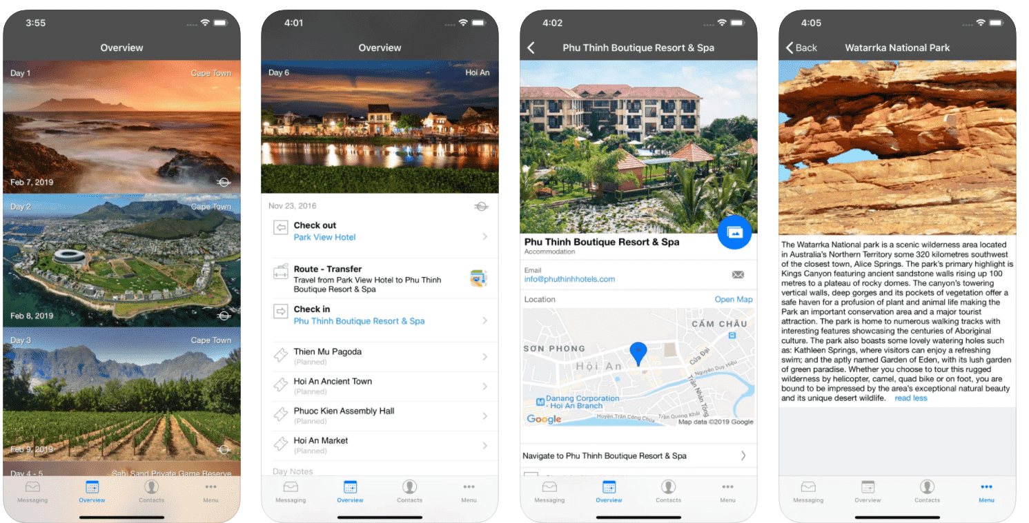 Once you’re logged into the app, you’ll be able to read information about your desintations, see descriptions of hotels or lodges and even see your flights and transfer schedule.